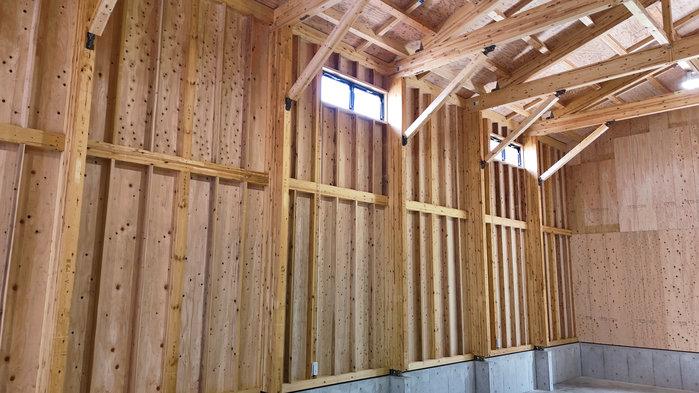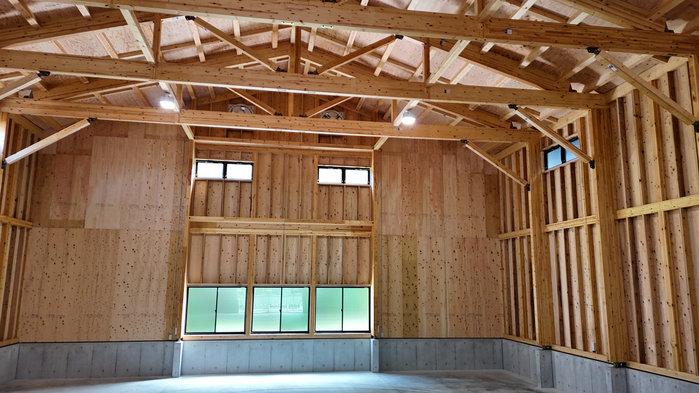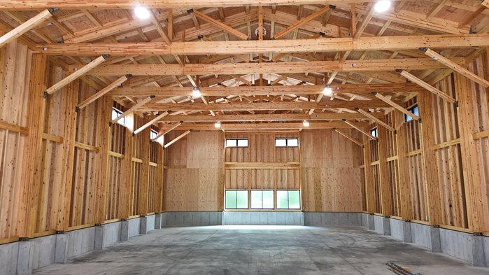 - 夏場の暑さ対策として、屋根合板を2重に貼り、その中に断熱材65㎜を挟み込むことによって作業環境の向上を図ります。